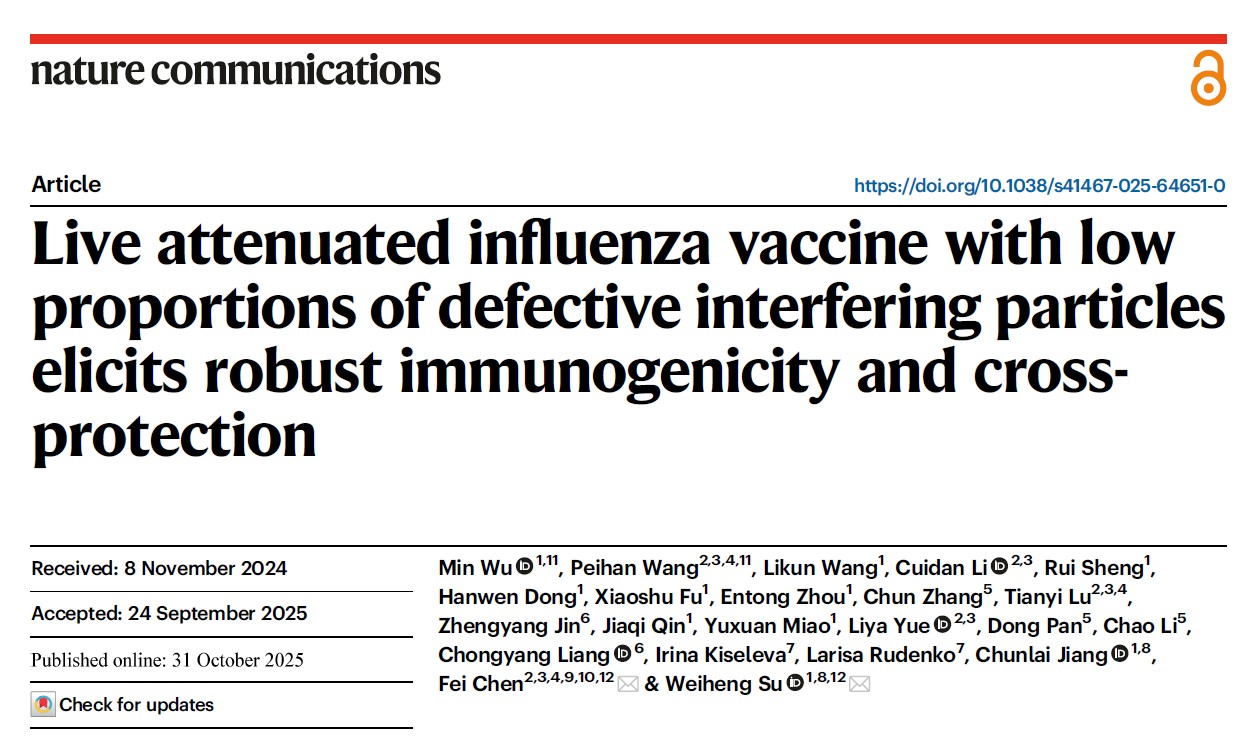 艾滋病疫苗国家工程实验室苏维恒教授团队与中国科投注北京基因组研究所陈非研究员团队合作,创新性地开发了降低DIPs含量的LAIV。该疫苗不仅具有上呼吸道复制优势,还能够增加抗原提呈,能够诱导相比传统LAIV和灭活流感疫苗显著增强的免疫原性、广谱中和活性与体内交叉保护能力,同时安全性良好。该研究为增加流感疫苗保护效力的实践提供了新策略。研究成果于2025年10月31日在国际学术期刊Nature Communications上正式发表。