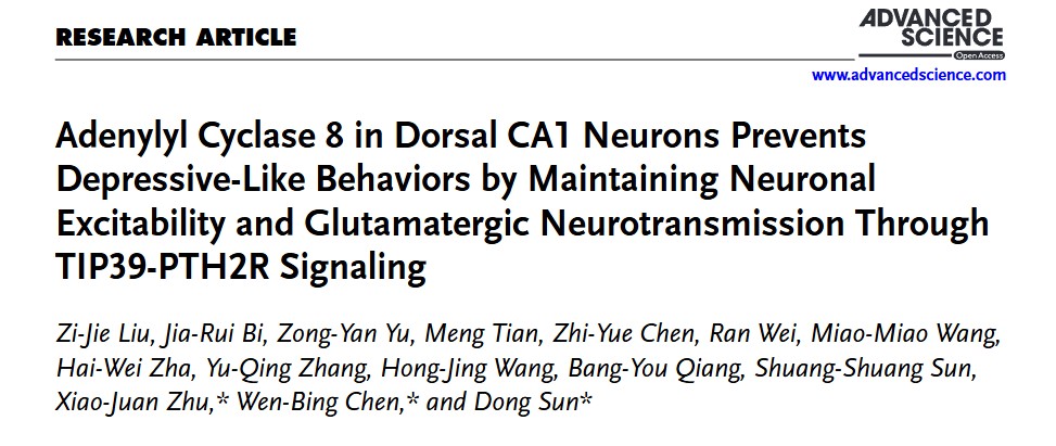 朱筱娟教授团队、广州医科大学基础医投注陈文兵教授团队,在抑郁症发病机制研究领域取得重要突破。该研究通过整合行为学、高通量测序、电生理记录及钙信号光纤成像等技术手段,创新性提出背侧海马腺苷酸环化酶8(ADCY8)功能异常是抑郁症发生的关键风险因素,为抑郁症的病理机制阐释和靶向干预提供了全新的理论依据。研究成果于2025年12月12日在国际学术期刊《Advanced Science》上发表。