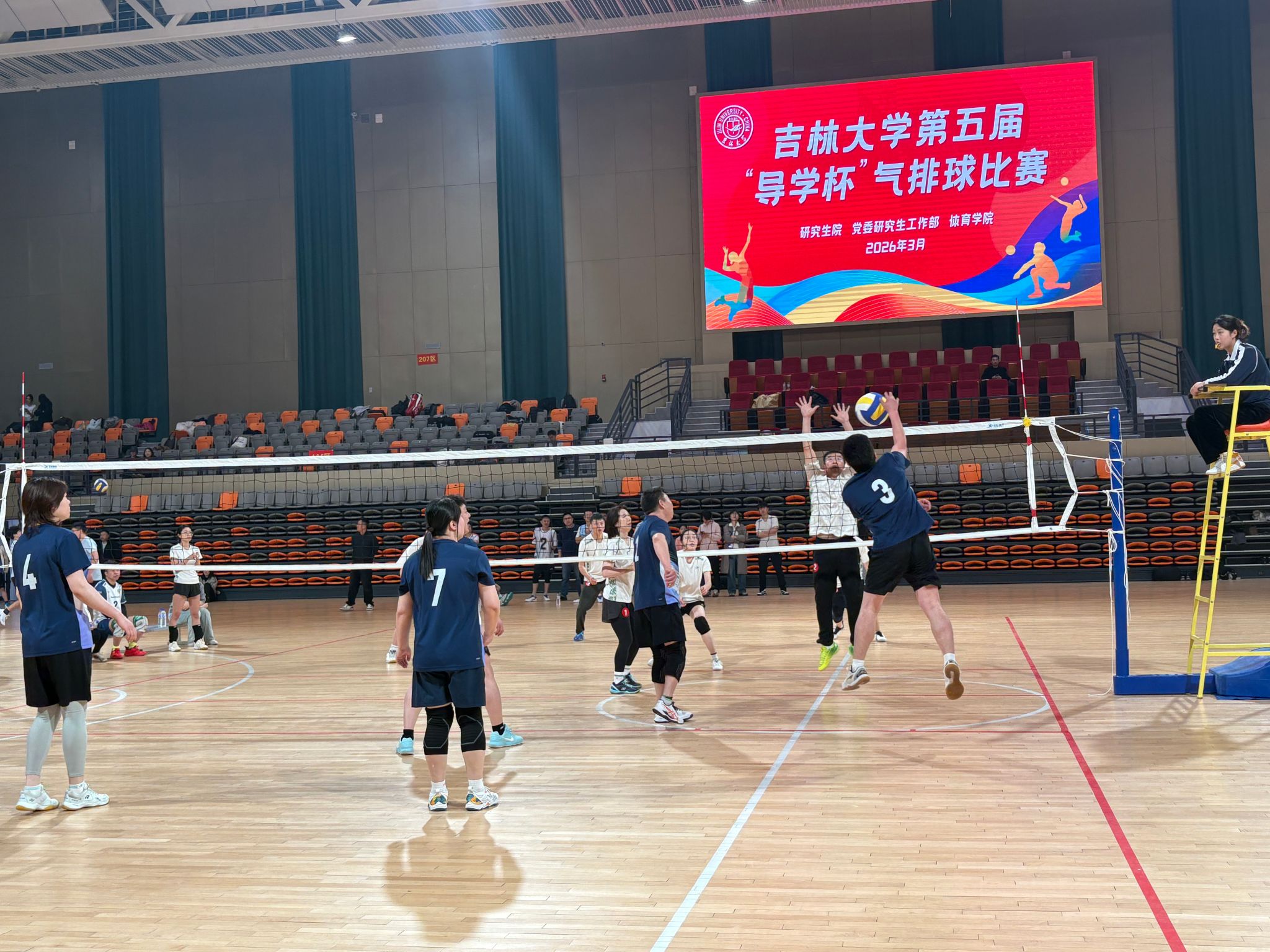 师生代表队精神抖擞、斗志昂扬。赛场上,队员们配合默契、敢打敢拼,面对强劲对手毫不畏惧,每一次发球都精准有力,每一次垫球都稳健扎实,每一次扣杀都全力以赴,每一次救球都拼尽全力。导师与学生并肩作战,凭借灵活的战术调整、顽强的拼搏意志与出色的团队协作,打出多场精彩对决,展现了生科学子不畏强手、永不言弃的竞技精神。场下,投注啦啦队热情高涨,呐喊助威声此起彼伏,为队员们注入强大动力,营造了热烈浓厚的赛场氛围。